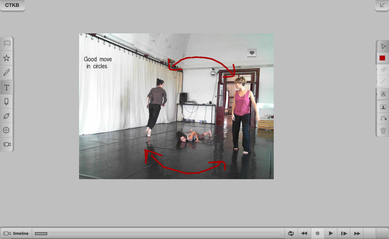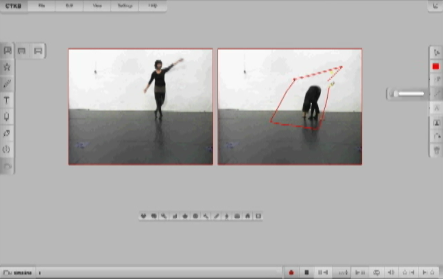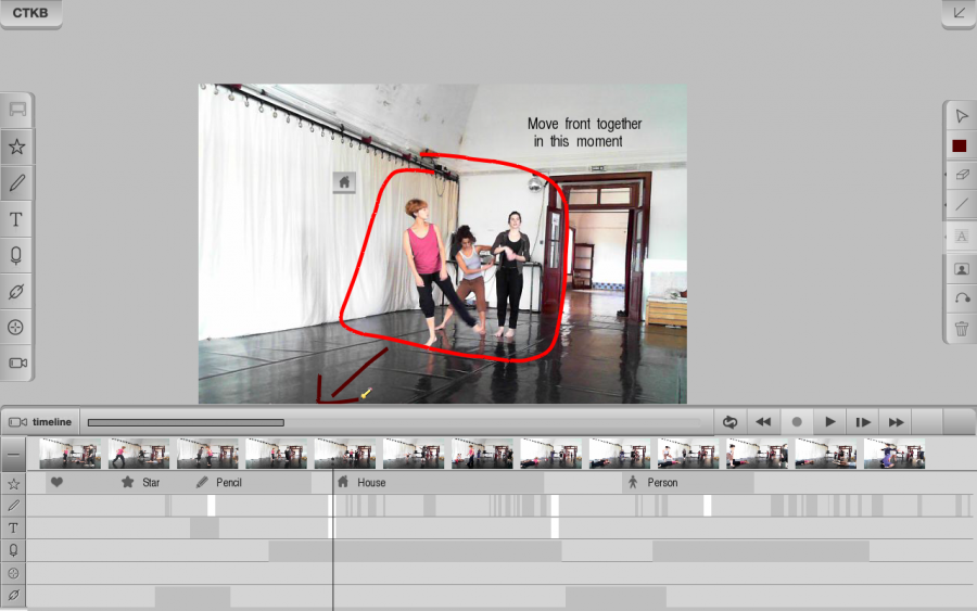The CREATION-TOOL is an original video annotator that was designed and developed from scratch as a software output deriving from the TKB project. It supports multimodal annotation and is applied to contemporary dance as a tool to support performance composition. It was conceived and designed to assist the creative processes of choreographers, functioning as a digital notebook for personal annotations. The prototype, developed for Tablet PCs, allows video annotation in real-time, using a live video stream, or post-event, using a pre-recorded video stream. The tool also allows different video annotation modalities, such as annotation marks, text, audio, ink strokes and hyperlinks. In addition, the system enables different modes of annotation and video visualization. The development followed an iterative design process involving two choreographers, and a usability study was carried out (see "Publications" section under the TKB project main menu), involving international dance performers participating in a contemporary dance residence - workshop. The CREATION-TOOL operational Manual and access to download are already available.